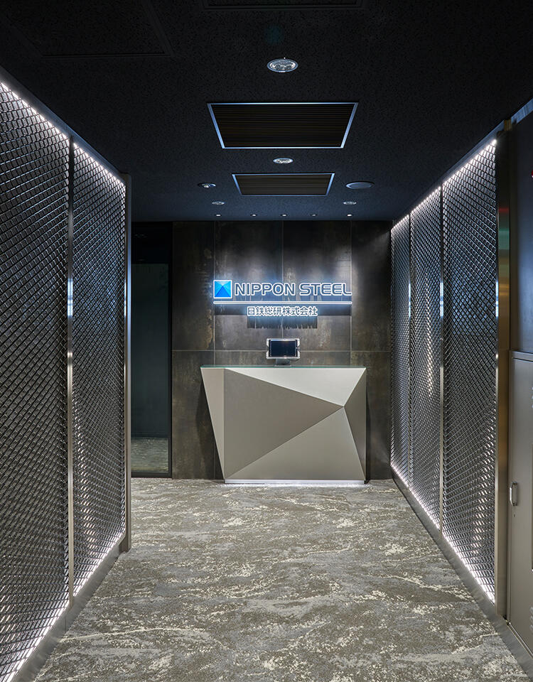 来客エリアは、日本製鉄の「鉄」の魅力や力強さ、美しさを表現し、各会議室は日本各地の地域産業を象徴とするデザインや、グローバル企業な地域の特色を体現できる空間づくりを目指した。