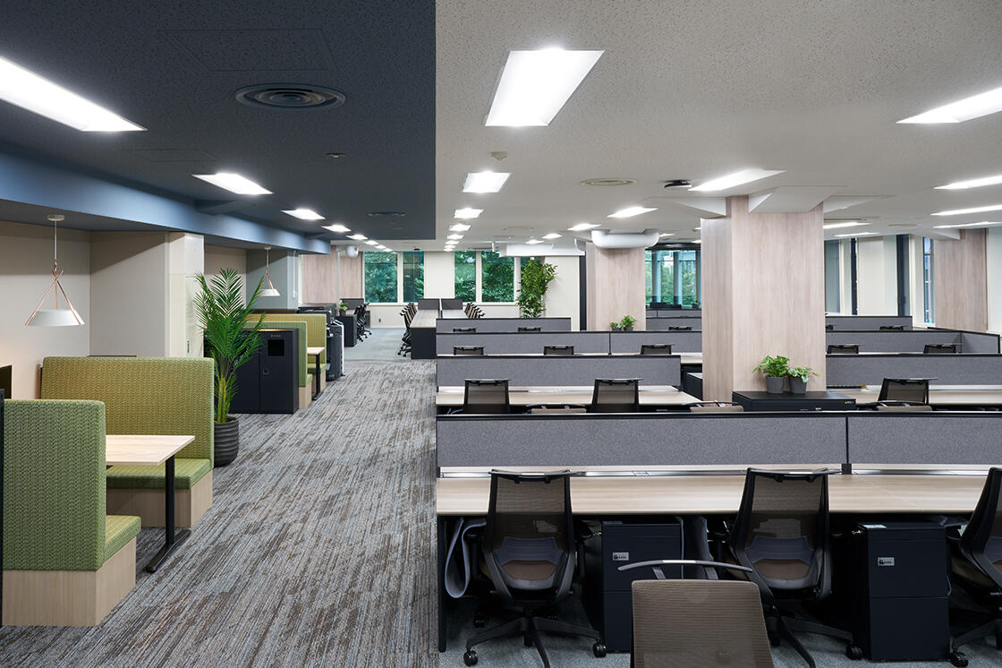 オフィスは、シンプルで落ち着きある色調で整えつつ、隣接するコミュニケーションスペースはワーカーが気軽に、自由に、そして活発に集えるカフェデザインとし、新たな日鉄総研の文化発信地をつくった。