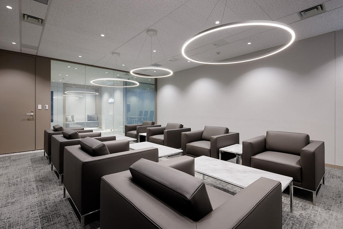 執務エリアの内装デザインは、白や木目を基調とし差し色として各エリアごとにチェアの色を分けることで、働く場をより楽しく、より選びやすくする工夫をした。ゲストエリアの内装デザインは、信頼感、清潔感、品格を感じられる空間に仕上げた。