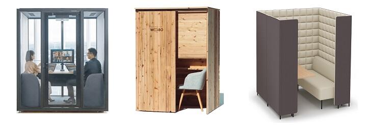 防音性はありませんが、電話やWEB会議は可能。気軽に使いやすく、外部からも声がかけやすいというメリットがあります。パソコン使用時に背面が映りにくくする、周囲の視線を遮るようにカバーするタイプもあるので、半個室でも自席より作業がしやすいかもしれません。